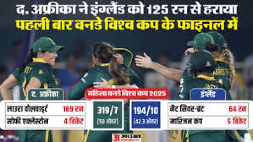 महिला वनडे विश्व कप 2025 के पहले सेमीफाइनल में दक्षिण अफ्रीका ने इंग्लैंड को 125 रन से हराकर फाइनल में जगह बना ली। गुवाहाटी के बारसपारा क्रिकेट स्टेडियम में बुधवार को खेले गए मुकाबले में दक्षिण अफ्रीका ने कप्तान लाउरा वोलवार्ड्ट की शानदार शतकीय पारी के दम पर 50 ओवर में 7 विकेट खोकर 319 रन बनाए। जवाब में इंग्लैंड की टीम 42.3 ओवर में मात्र 194 रन पर सिमट गई और ऑलआउट हो गई। गेंदबाजी में मारिजन कप ने बेहतरीन प्रदर्शन करते हुए पांच विकेट झटके, जबकि नादिन डी क्लार्क ने दो विकेट अपने नाम किए। इसके अलावा आयबोंगा खाका, म्लाबा और सुने लूस को एक-एक सफलता मिली।
