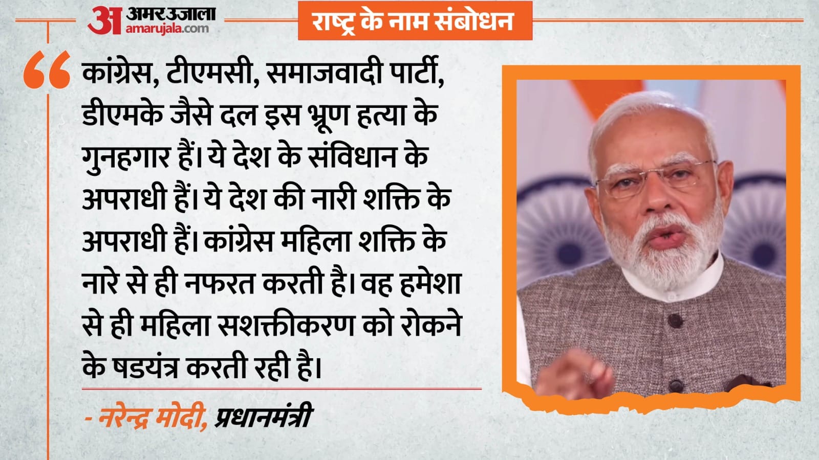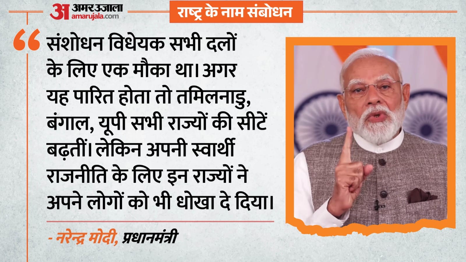 पीएम ने आगे कहा, "सरकार के आश्वासन के बावजूद कांग्रेस, डीएमके, टीएमसी और सपा जैसे दल इसे मानने के लिए तैयार नहीं हुए। यह संशोधन विधेयक सभी दलों के लिए एक मौका था। अगर यह पारित होता तो तमिलनाडु, बंगाल, यूपी सभी राज्यों की सीटें बढ़तीं। लेकिन अपनी स्वार्थी राजनीति के लिए इन राज्यों ने अपने लोगों को भी धोखा दे दिया। डीएमके के पास मौका था कि वह और ज्यादा तमिल लोगों को सांसद बना सकती थी और तमिल लोगों की आवाज मजबूत कर सकती थी। टीएमसी के पास भी बंगाल के लोगों को आगे बढ़ाने का मौका था, लेकिन उन्होंने यह मौका गंवा दिया।