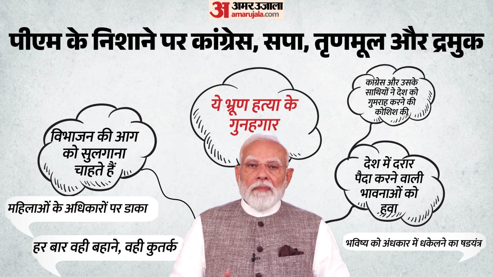 ग्राफिक्स में PM मोदी की बड़ी बातें: 'कांग्रेस विभाजन का षड्यंत्र कर रही; SP, TMC-DMK ने भी जनता को धोखा दिया'