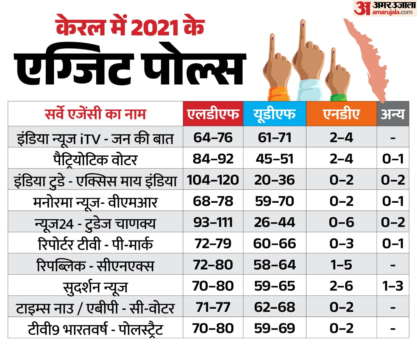 कई बड़ी सर्वे एजेंसियों ने एलडीएफ को दो-तिहाई बहुमत के करीब या स्पष्ट जीत मिलने का अनुमान लगाया था। वहीं, कुछ और एग्जिट पोल्स में मुख्य विपक्षी दल- संयुक्त लोकतांत्रिक मोर्चा (यूडीएफ) और एलडीएफ के बीच काफी कड़े मुकाबले का अनुमान जताया गया, हालांकि बढ़त लेफ्ट को ही दी गई थी।