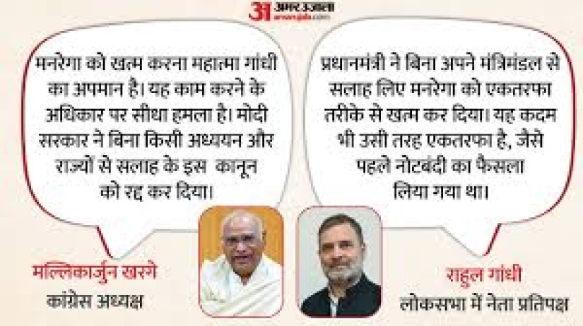 खरगे ने कहा, मनरेगा यूपीए सरकार का एक दूरदर्शी कानून था, जिसकी सराहना पूरी दुनिया में हुई। उन्होंने कहा कि इस योजना का असर इतना बड़ा था कि इसका नाम महात्मा गांधी के नाम पर रखा गया। मनरेगा को खत्म करना महात्मा गांधी का अपमान है। यह काम करने के अधिकार पर सीधा हमला है।उन्होंने आरोप लगाया कि (केंद्र की नरेंद्र) मोदी सरकार ने बिना किसी अध्ययन, मूल्यांकन या राज्यों और राजनीतिक दलों से सलाह लिए इस कानून को रद्द कर दिया। उन्होंने कहा कि सरकार ने ऐसा ही तरीका तीन कृषि कानूनों के साथ अपनाया था। उन्होंने कहा कि मनरेगा को खत्म करने के खिलाफ पूरे देश में आंदोलन की जरूरत है। उन्होंने कहा कि सरकार के इस फैसले का हर जगह विरोध होना चाहिए और इसके लिए 2015 में जमीन अधिग्रहण कानून में किए गए बदलावों को वापस लेने का उदाहरण दिया। उन्होंने कहा, यह हम सबकी सामूहिक जिम्मेदारी है कि मनरेगा को लेकर ठोस योजना बनाएं और देशभर में जन अभियान शुरू करें।