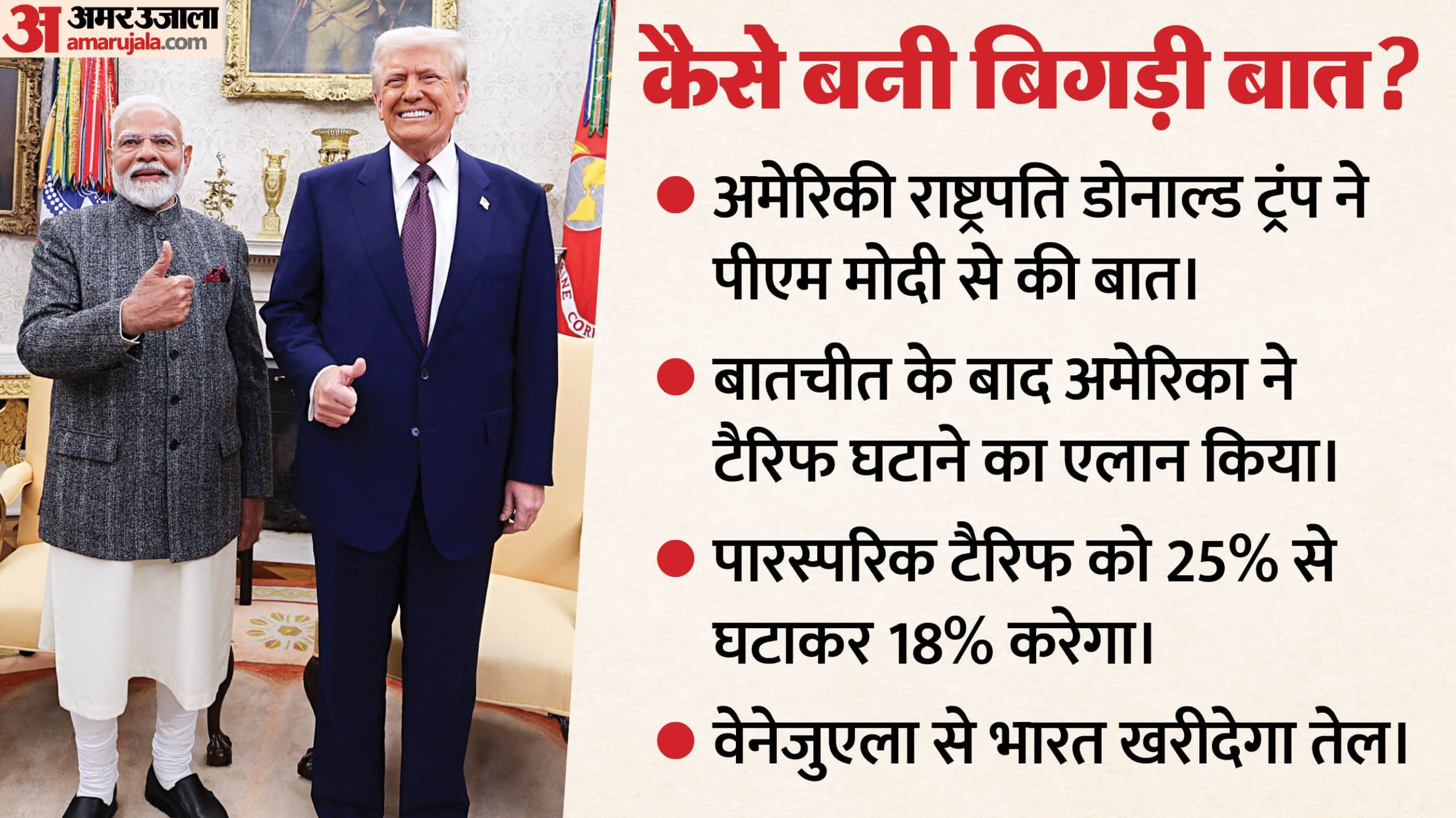 गौरतलब है कि अमेरिकी राष्ट्रपति ट्रंप ने ट्रुथ सोशल पर लिखा 'प्रधानमंत्री मोदी के प्रति मित्रता और सम्मान के कारण और उनके अनुरोध पर तत्काल प्रभाव से हमने अमेरिका और भारत के बीच एक व्यापार समझौते पर सहमति व्यक्त की, जिसके तहत अमेरिका पारस्परिक शुल्क को 25% से घटाकर 18% कर देगा।'