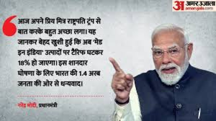 प्रधानमंत्री नरेंद्र मोदी ने अपने सोशल मीडिया प्लेटफॉर्म एक्स पर लिखा कि उन्होंने अमेरिकी राष्ट्रपति डोनाल्ड ट्रंप के साथ बातचीत की और यह जानकर बेहद खुशी हुई कि अमेरिका ने 'मेड इन इंडिया' उत्पादों पर टैरिफ घटाकर 18% कर दिया है। पीएम मोदी ने ट्रंप का धन्यवाद करते हुए कहा कि यह घोषणा भारत के 1.4 अरब लोगों के लिए बेहद महत्वपूर्ण है।