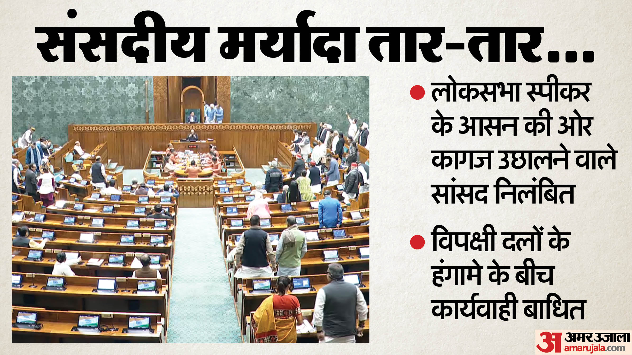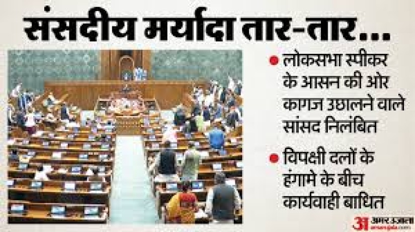 संसद की कार्यवाही के दौरान मंगलवार सदन की मर्यादा टूटने का मामला सामने आया। सत्र में खूब हंगामा देखने को मिला। इसके बीच कुछ सांसदों ने स्पीकर के आसन की ओर कागज फेंके। इस पर सख्त कार्रवाई करते हुए संबंधित सांसदों को सत्र की शेष अवधि के लिए निलंबित कर दिया गया। आठ सांसदों पर ये कार्रवाई हुई है। भारी शोर-शराबे और विरोध के कारण सदन की कार्यवाही कई बार रोकनी पड़ी। वहीं, कार्यवाही कल यानी बुधवार तक के लिए स्थगित कर दी गई है।